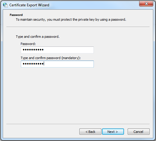 Next, create a password to protect the PKCS12. This will be required when you later import the certificate into another browser/mail client or device.