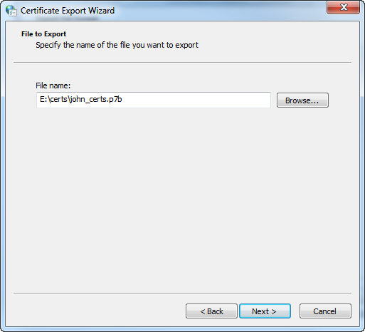 Your certificate will be exported to a PKCS12 file. Click 'Browse' and navigate to the location where the certificate should be saved and click 'Next'.